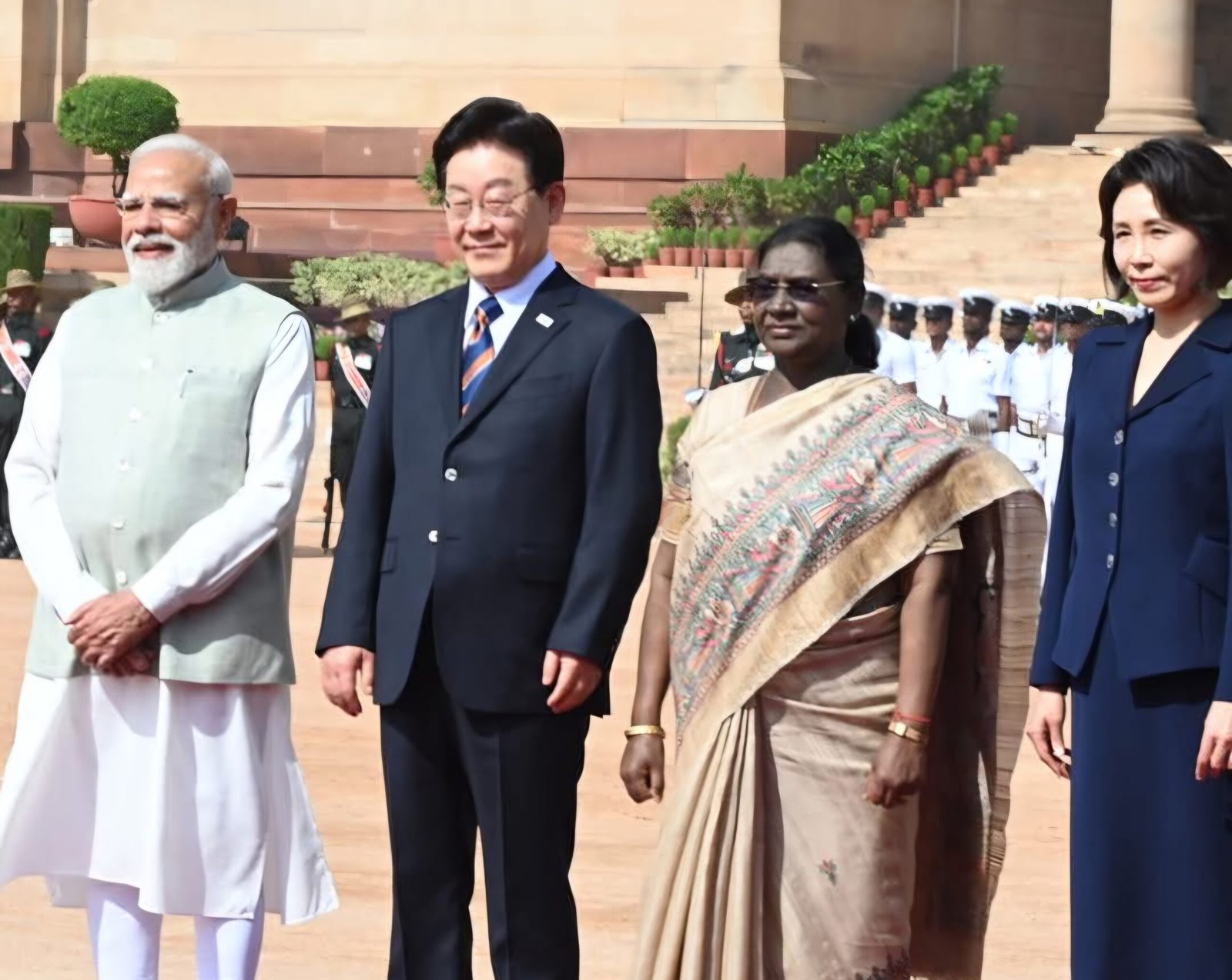 President Droupadi Murmu and Prime Minister Narendra Modi jointly welcomed the President of South Korea, Lee Jae Myung, and his wife Kim Hea Kyung during a ceremonial reception at Rashtrapati Bhavan.